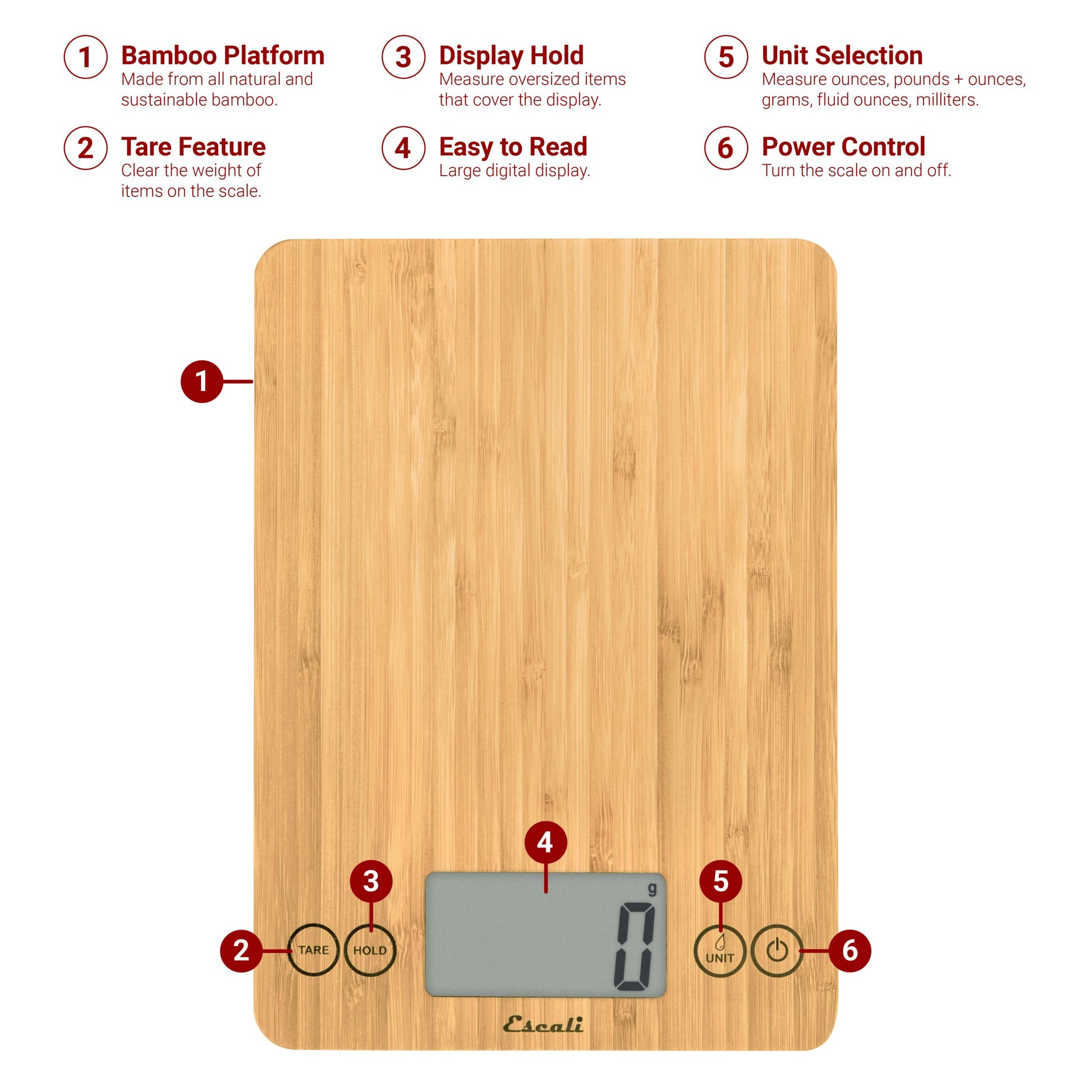 Offering an impressive 15-pound (7000 g) capacity with accuracy down to 0.1 ounces (1 gram), the Escali Arti Digital Scale ensures flawless measurements for every recipe, big or small. The large, easy-to-read digital display and bamboo surface seamlessly blend form and function, enabling precise measurements without compromising style. Also available in luxe, shimmering metallic colors, the Arti is more than a tool—it’s a statement piece that enhances both modern and vintage-inspired spaces.