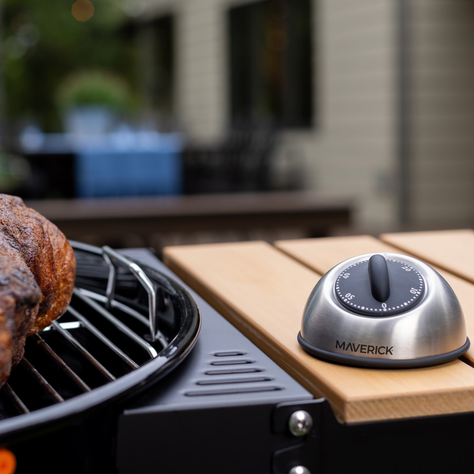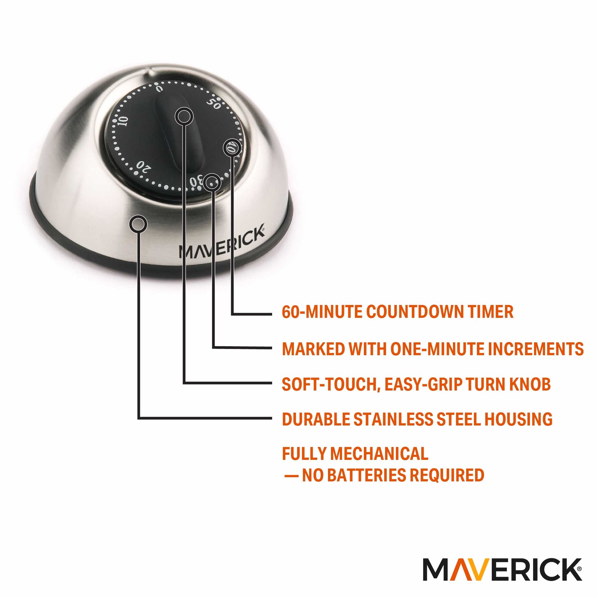 The Maverick Classic Metal Timer is a dependable, no-fuss tool for every kitchen. Set up to 60 minutes with easy-to-read one-minute increments using the soft-touch, easy-grip knob. Its stainless steel housing and non-skid base provide durability and stability, while the fully mechanical design means no batteries are ever needed. The timer ticks as it counts down, and rings for three seconds when time’s up, combining practicality with a timeless, classic design that looks as good as it performs.