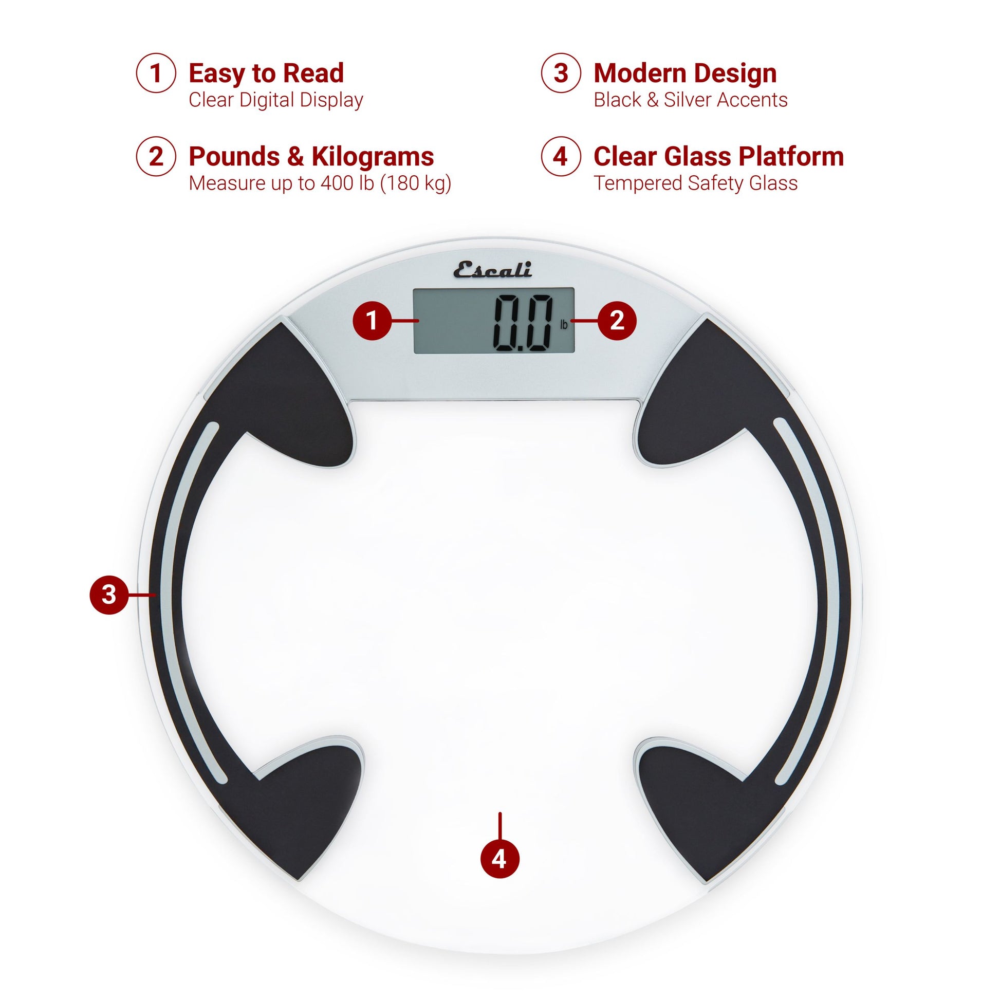 The Escali Clear Glass Bathroom Scale features an impact resistant safety glass platform, sleek black accents and high weight capacity