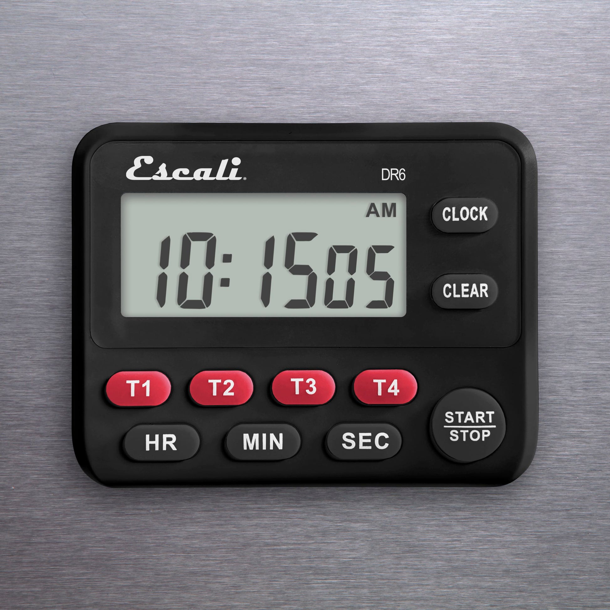 The Escali DR6 Four Event Digital Timer helps you track up to four separate events at once. Each timer channel can count up or down to a maximum of 99 hours, 59 minutes and 59 seconds. The overtime feature will keep track of how long a timer has been expired and the recall feature can quickly reset the previous timer setting for repetitive tasks.