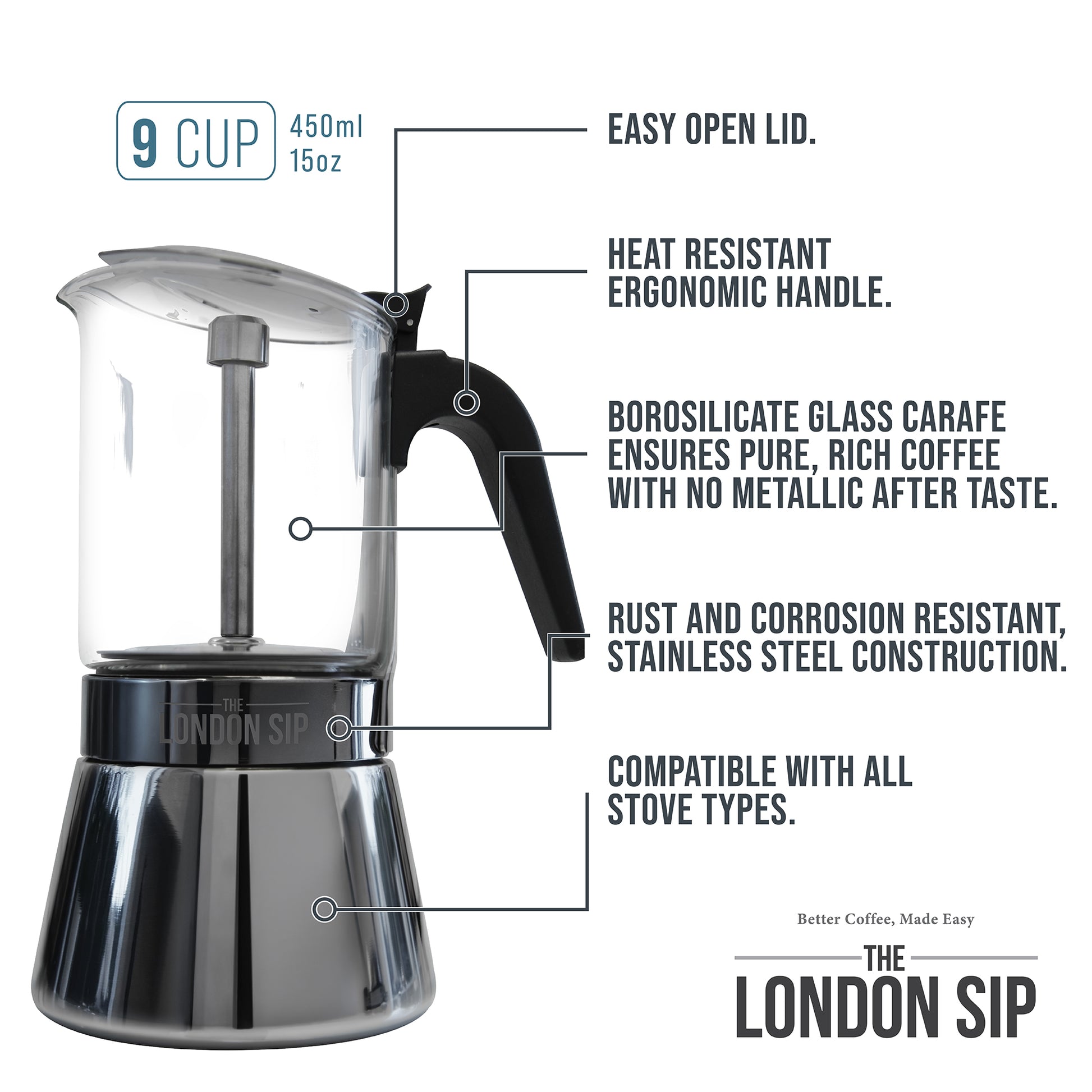 - Simple and extremely easy to use. If you use an electric coffee maker you can easily make better tasting coffee with the London Sip espresso maker.