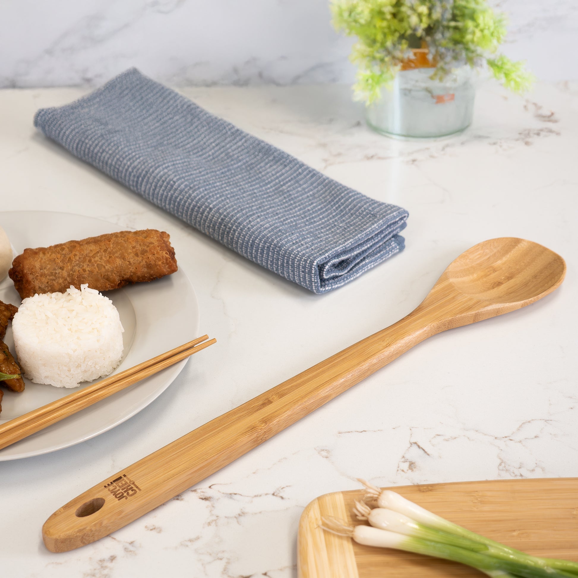The Joyce Chen 18-inch Burnished Bamboo Mixing Spoon will quickly become your go to mixing spoon, whether you're baking, making soup or, tossing a stir-fry.
