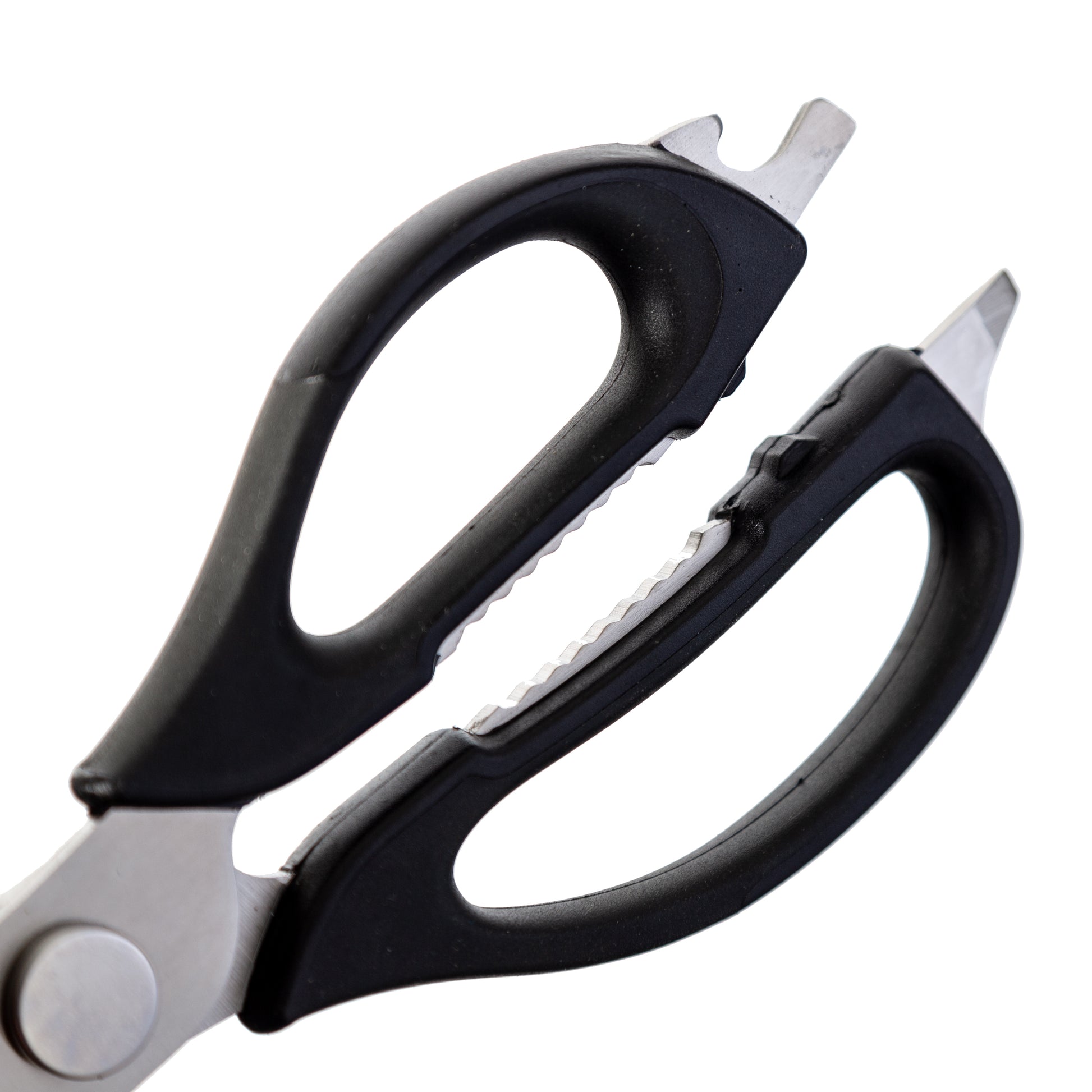 The serrated teeth between the rubber handles make it easy to pop open bottles and crack nuts. And when it's time to clean up, the blades separate for a thorough and easy cleaning process. These stainless steel kitchen shears are made with high quality materials for durability and longevity.