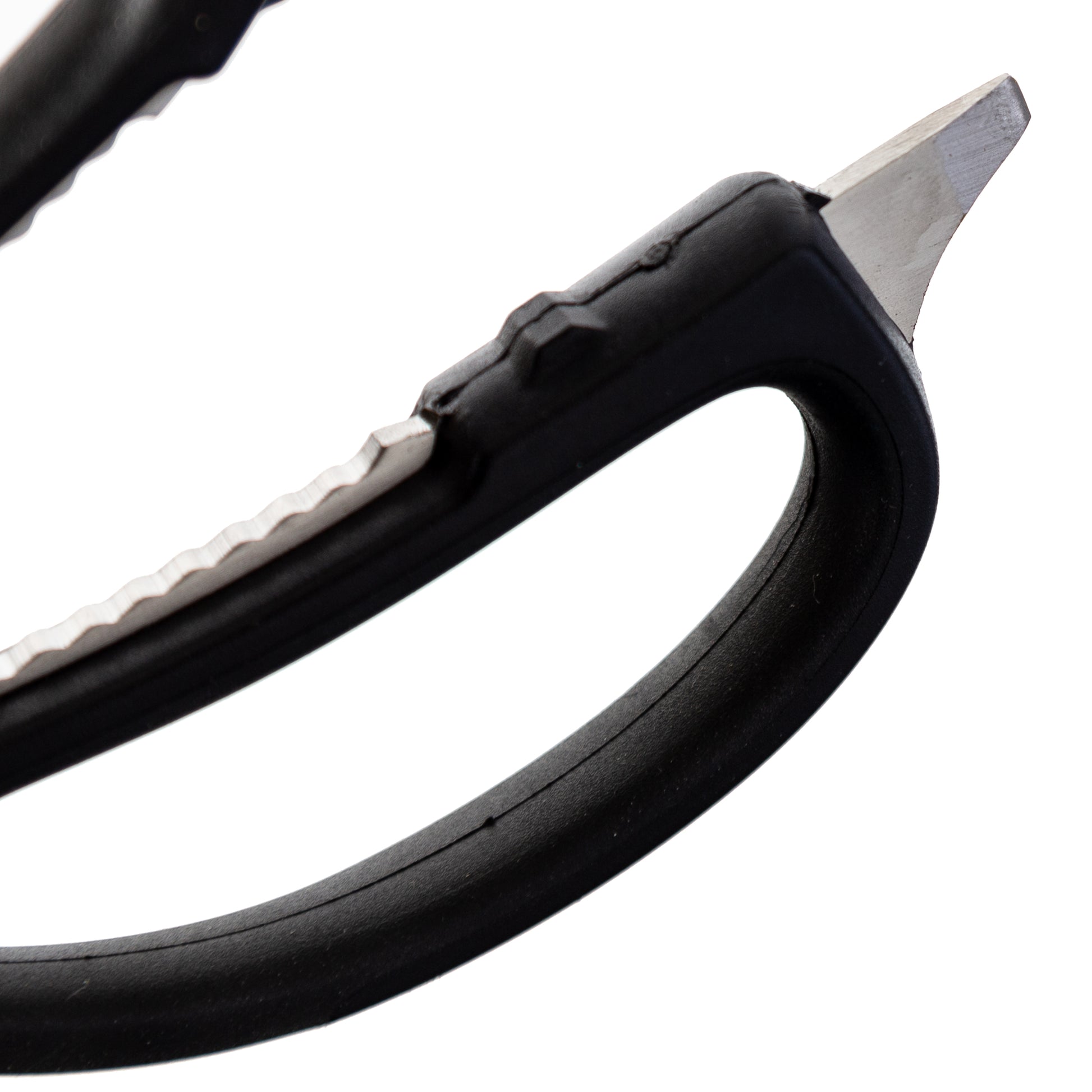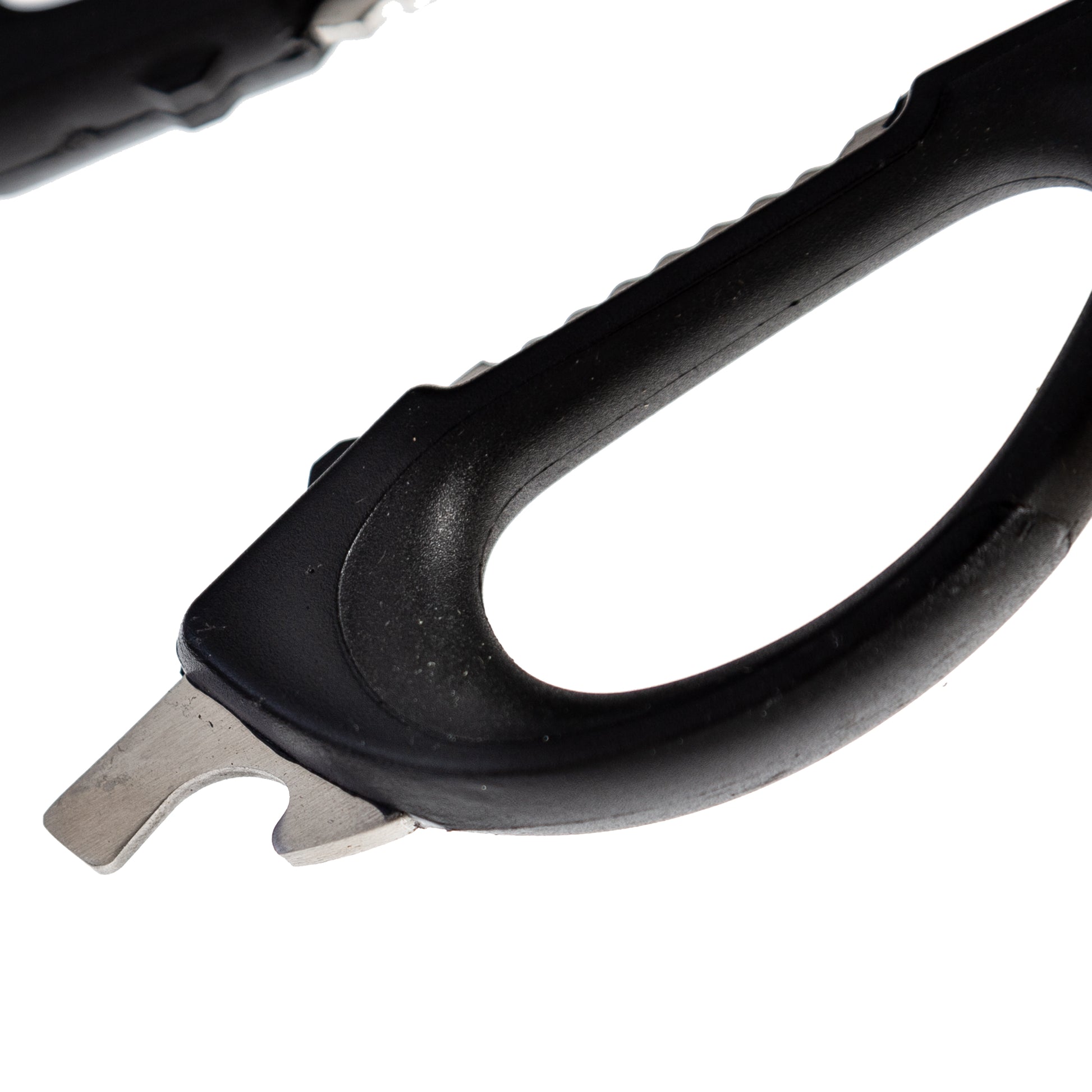 - Serrated teeth between the rubber handles acts as a built-in bottle opener or nut cracker