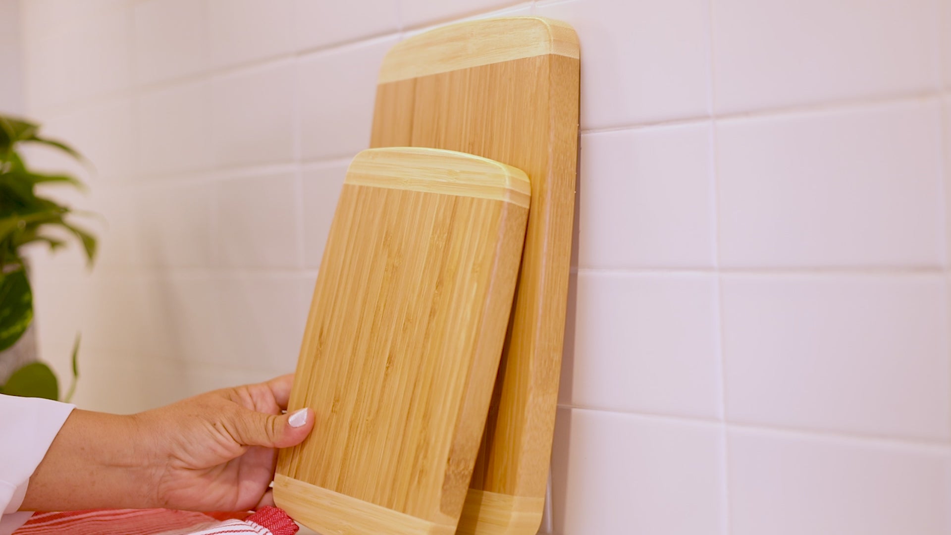 Crafted from eco-friendly and sustainable bamboo, these cutting boards are both functional and environmentally conscious. The lacquer finish helps protect the cutting boards, retains their two-tone color and resists deterioration over time. The surface is sturdy for chopping but gentle on your knives, keeping them sharper longer.