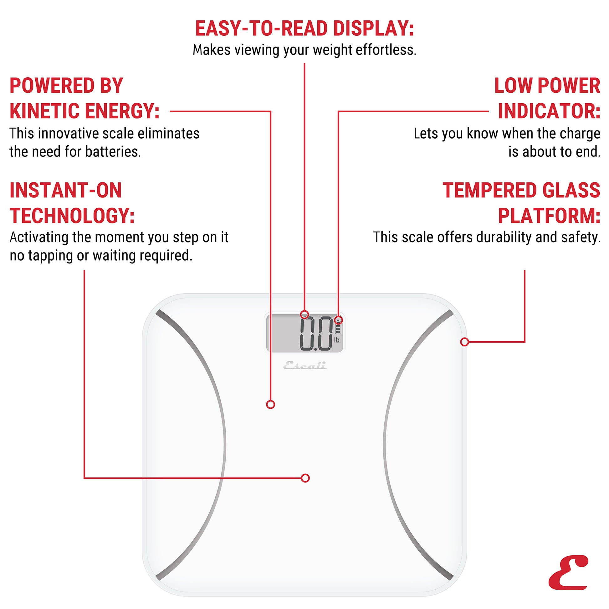 Experience a smarter, more sustainable way to track your health with the Escali Kinetic Bathroom Scale. Powered by kinetic energy, this innovative scale eliminates the need for batteries—simply step on and it’s ready to weigh. With this battery-free design, you're not only making a smarter choice for your home, but you're also helping reduce waste and your carbon footprint. In addition to being eco-friendly, its compact and lightweight design makes it easy to store in tight spaces, making it perfect for any home. The scale features instant-on technology, activating the moment you step on it—no tapping or waiting required. Its large, easy-to-read display makes viewing your weight effortless, while the display hold function gives you extra time to check your results. Plus, the low power indicator lets you know when the charge is about to end, so you're never caught off guard. Made with a tempered glass platform, this scale offers durability and safety, providing peace of mind. With the ability to switch between pounds and kilograms, it’s the perfect scale for anyone seeking simplicity and reliability in their weight tracking routine. Embrace a more eco-conscious lifestyle without sacrificing convenience. With auto-off technology and a sleek, space-saving design, the Escali Kinetic Scale is the smarter, greener choice for your home.