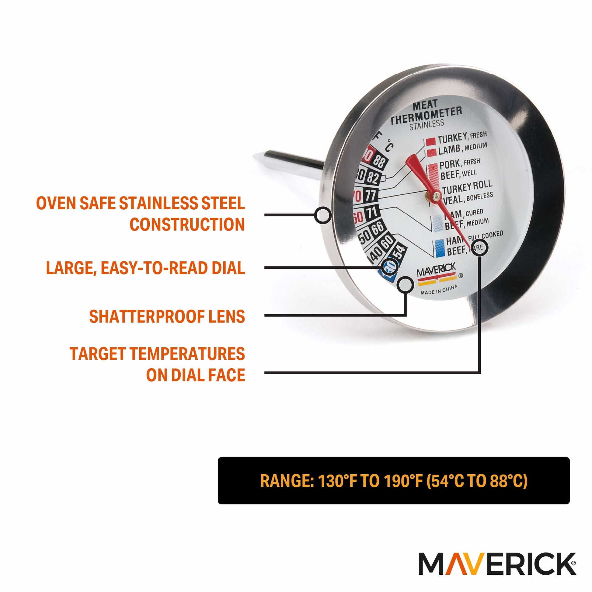 Cook with confidence using the Maverick Large Dial Meat Thermometer, designed to stay in your meat throughout the entire cooking process for accurate, worry-free results. With a temperature range of 130°F to 190°F (54°C to 88°C), this durable stainless steel thermometer features a large, easy-to-read dial and a shatterproof lens for clear visibility and lasting performance. Convenient target cooking temperatures for beef, poultry, pork, veal, and ham are printed directly on the dial face, making it easy to achieve perfect results every time. Safe for use in the oven and readable in both Fahrenheit and Celsius, it’s an essential tool for any home chef.